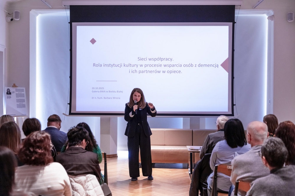 W ramach projektu „Muzeum pamięci” Galeria Bielska BWA organizuje warsztaty muzealne dla osób z chorobami otępiennymi, Alzheimerem, Parkinsonem, a również dla osób w stanach poudarowych. Spotkania te pomagają zapobiegać wykluczeniu społecznemu i marginalizacji osób chorych. Od trzech lat Bielskie BWA organizuje też edukacyjne prelekcje dotyczące demencji. W tym roku nasi terapeuci i pracownicy skorzystali z zaproszenia na prelekcję dr Barbary Wrony pt. „Sieci współpracy. Rola instytucji kultury w procesie wsparcia osób z demencją i ich partnerów w opiece”. Wykład stanowił próbę zwrócenia uwagi na projekty i programy, które zostały zrealizowane w przestrzeniach instytucji kultury.